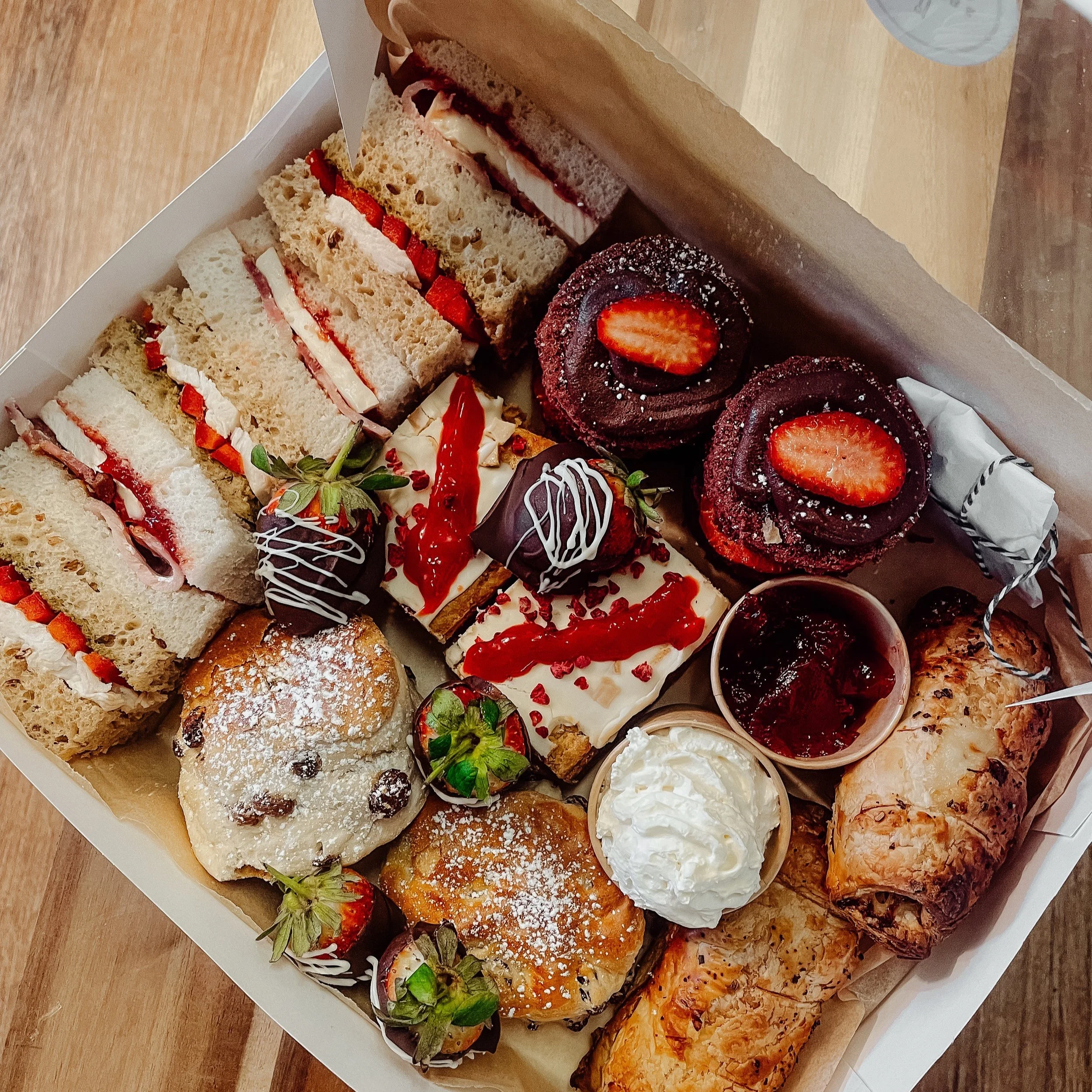 A valentines themed afternoon tea worthy of any picnic date! A selection of sweet and savoury goodies to please everyones tastebuds. Perfect for a trip to the park!